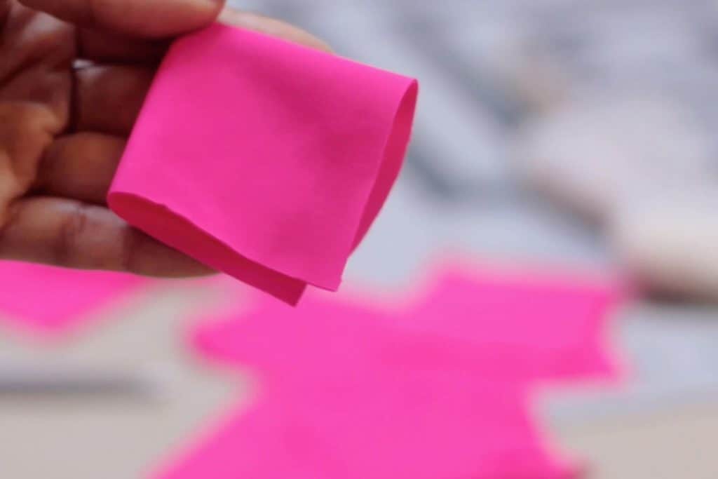 I started by cutting the two main front pieces from the nylon spandex, then did the same with the four lining pieces. I also cut the strips of fabric for the straps — the width for those is 1 5/8″ (or 4 cm), and below you’ll find the length I suggest for each one. Of course, feel free to play around and make them as long or short as you like!