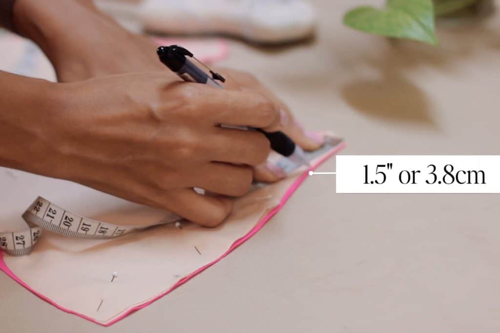 Mark 1.5” down from the triangle’s top tip and 2” up from the bottom edge on both sides. Using a zigzag stitch (length 4, width 4), sew 1/4” elastic between these marks, stretching slightly.