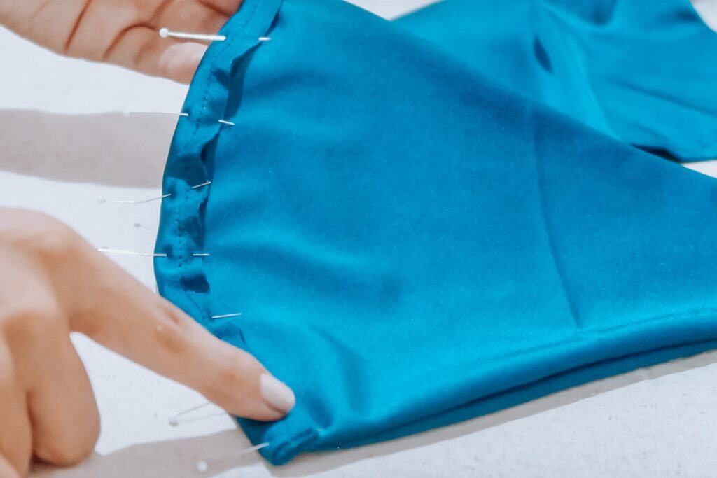 After turning the pieces right side out, stay-stitch the bottom edges. Then measure, fold, and pin 1” up to create the string tunnel. Zigzag stitch along the edge