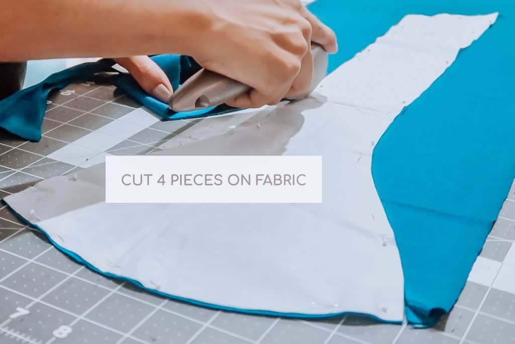 To make this DIY multiway bikini top cut 4 pattern pieces on the stretch fabric, plus a 59″ by 1 5/8″ strip for the under bust strap.