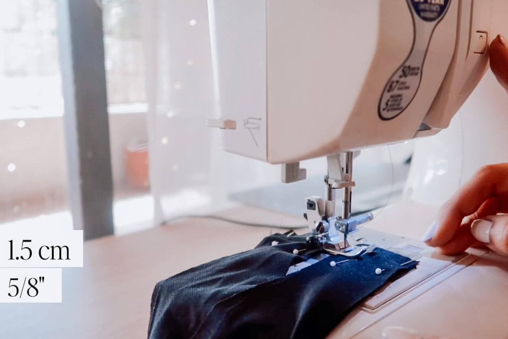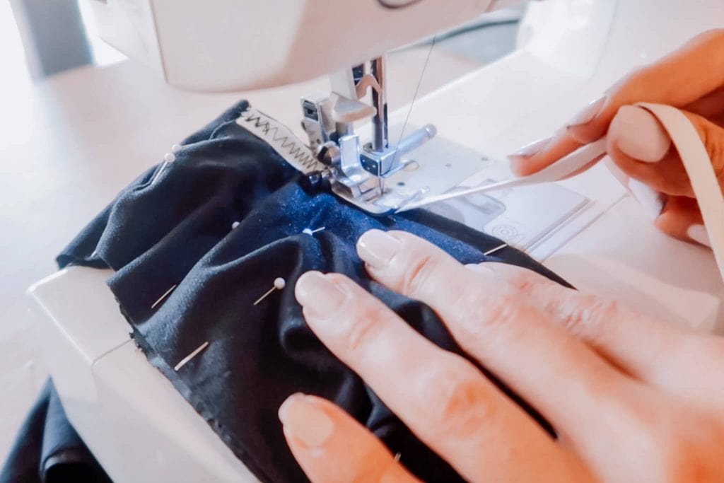 Mark a straight line down the center of the back piece, and place a 1/4” elastic along this line. Use a straight stitch on your sewing machine, stretching the elastic with one hand to create a gathered effect while gently guiding the fabric with the other.
