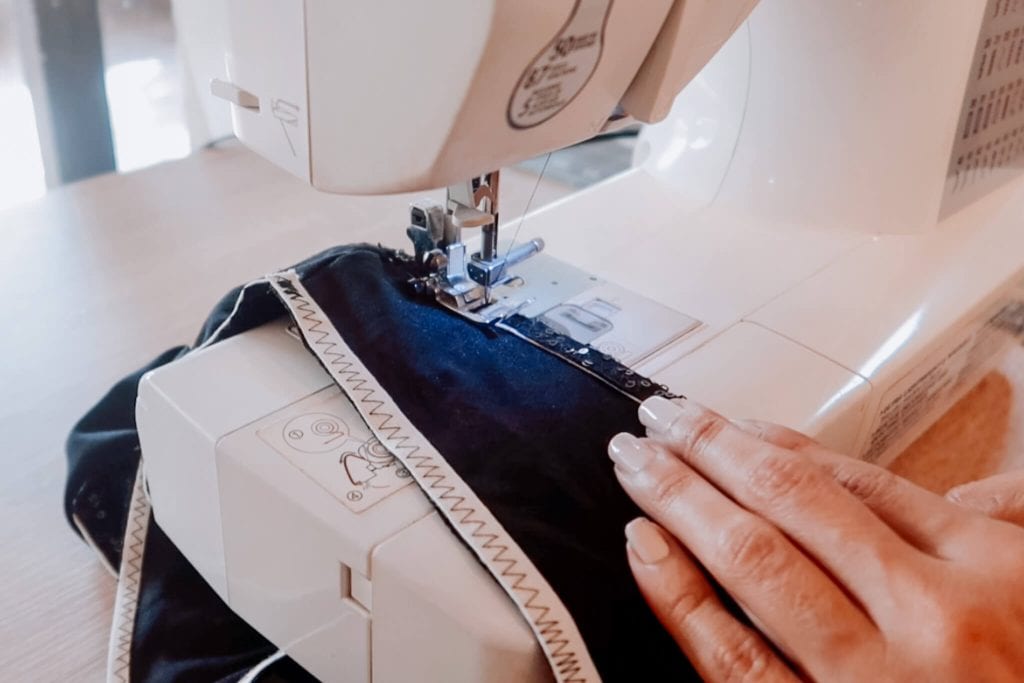 Place the fabric and lining with the good sides facing out, and pin around the edges. Using a zigzag stitch, sew the 3/8” elastic along the leg openings and the 1/4” elastic to the waistline. Sew with slight tension and after that make a small cut at the front center to help it lay flat.